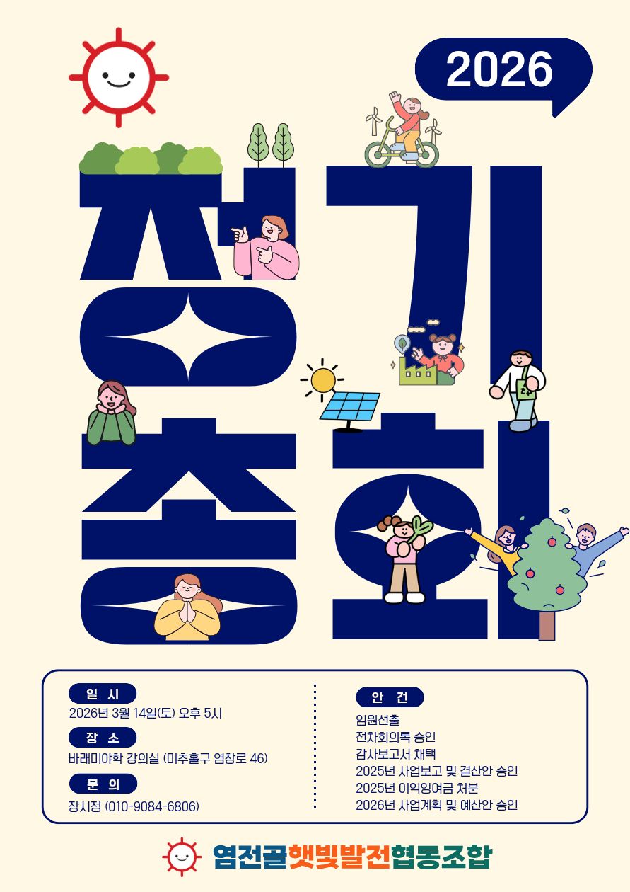 염전골햇빛발전협동조합 2026년 총기총회를 다음과 같이 공고합니다.
